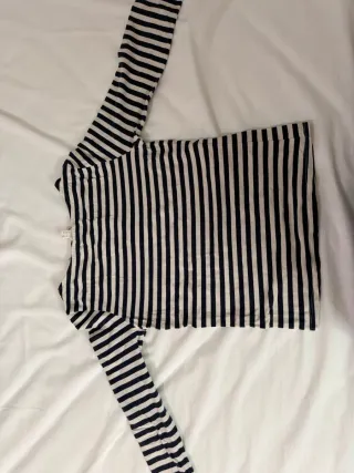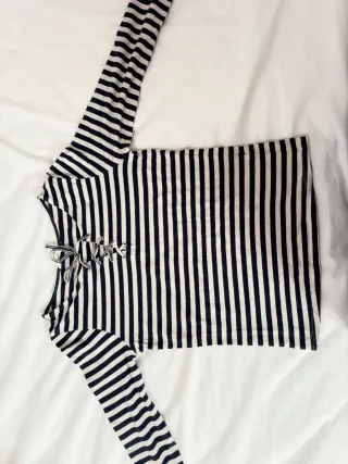 Camiseta de manga larga con un diseño de rayas verticales. Presenta un detalle de cordones en la zona del escote. - Diseño de rayas marineras. - Manga larga. - Escote con cordones.
