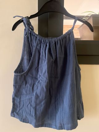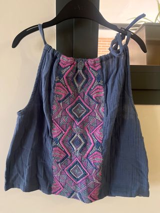 Camiseta de tirantes con un bonito diseño bordado en la parte delantera. - Tirantes con lazada. - Detalle de bordado geométrico en tonos rosa y azul. - Tejido ligero y con textura.