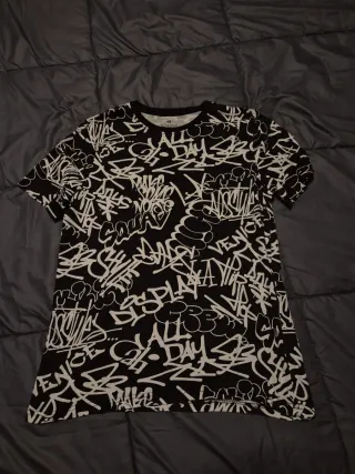Camiseta con estampado integral de estilo graffiti. - Diseño llamativo en blanco sobre fondo negro. - Cuello redondo y manga corta.