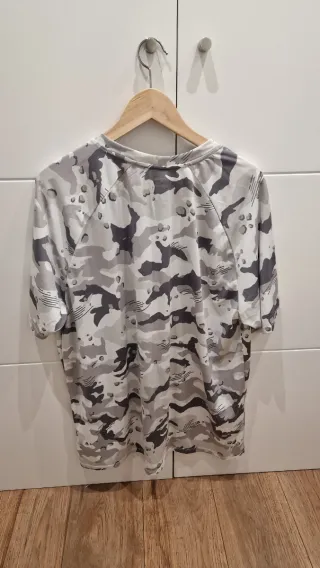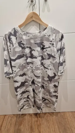 Camiseta de manga corta con estampado de camuflaje. - Diseño moderno en tonos grises y blancos. - Logo de Nike visible en el pecho.