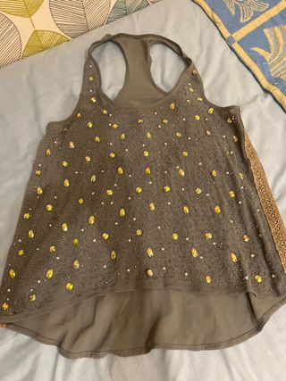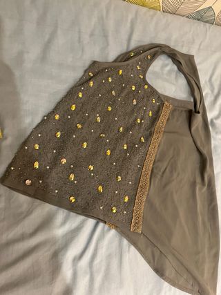 Elegante top con un diseño único y llamativo. - Adornado con pedrería y perlas. - Detalles de encaje dorado en el lateral. - Corte asimétrico en el bajo.