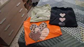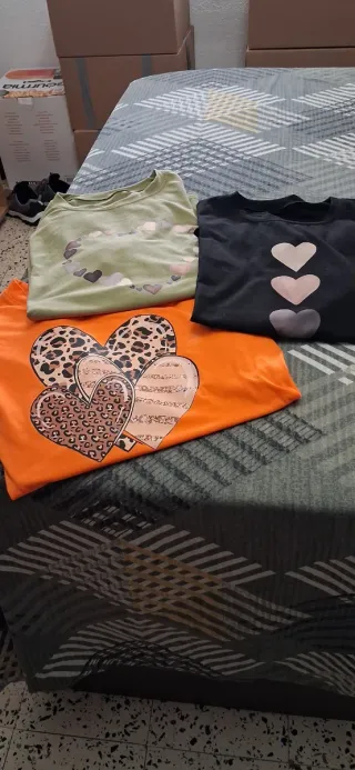Conjunto de tres camisetas con diseños de corazones. - Camiseta verde con corazones grises y rosas. - Camiseta negra con tres corazones apilados (rosa, gris, blanco). - Camiseta naranja con varios corazones de diferentes estampados (leopardo, rayas).