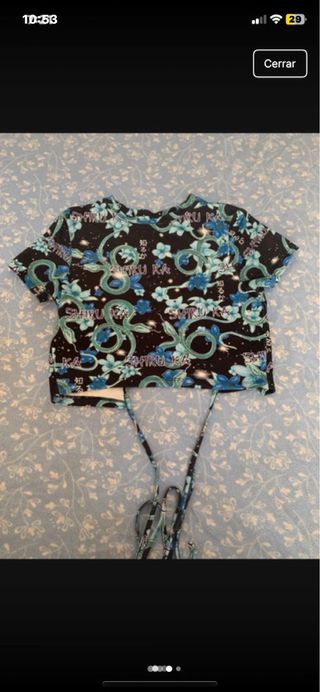 Camiseta corta con un llamativo estampado de serpientes y flores sobre fondo negro. Presenta un diseño moderno y atrevido. - Diseño de serpientes y flores. - Corte crop top. - Cordones para atar.