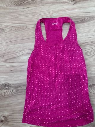 Camiseta de tirantes con un estampado de lunares blancos sobre fondo rosa. - Diseño de tirantes. - Estampado de lunares.