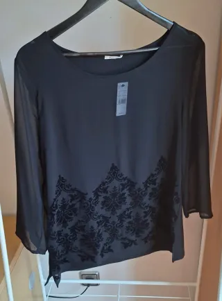 Elegante camiseta de manga larga con un delicado tejido de encaje. - Diseño con cuello redondo. - Acabado festoneado en el bajo y puños. Usada en 2 ocasiones ESCUCHO OFERTAS DE TODO MI ARMARIO!!