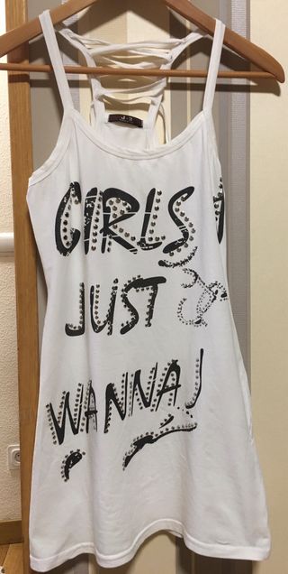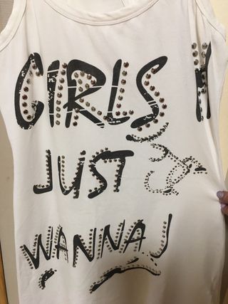 Camiseta de tirantes con un diseño moderno y llamativo. - Detalle de tachuelas plateadas. - Tirantes cruzados en la espalda. - Estampado Girls just wanna have fun con tachuelas. - Sisa 38cm sin estirar da hasta 44 cm