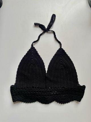 Top de crochet negro, perfecto para la playa o como accesorio de moda. - Diseño de tirantes y escote halter. - Detalle de puntilla en el borde inferior. - Acabado artesanal.
