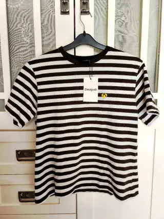 Camiseta de manga corta con diseño de rayas horizontales. Cuello redondo. Talla XS, corte ancho. Logo amarillo de Desigual en la parte frontal. 93% algodón 7% elastano. Nuevo, con etiqueta.