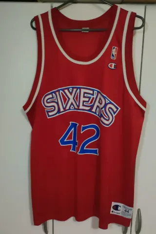Camiseta nueva de baloncesto de los Sixers con el número 42, talla de Jerry Stackhouse. - Diseño clásico en color rojo. - Logo de Champion en la parte frontal. - Escudo de la NBA. - Talla L