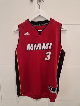 Camiseta sin mangas del equipo de baloncesto Miami Heat. - Diseño con el nombre MIAMI y el número 3 en la parte delantera. - Logo de Adidas en el pecho. - Logo de la NBA en la parte superior. - Paneles laterales en color rojo.