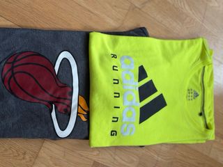 Pack de dos camisetas deportivas. - Camiseta Adidas Running de color verde neón. - Camiseta gris con diseño de los Miami Heat.
