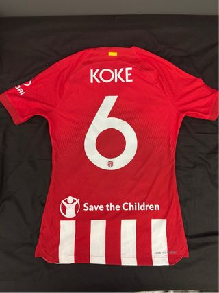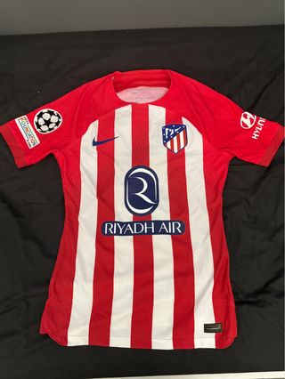 Camiseta match worn shirt oficial del Atlético de Madrid 23/24, talla S con dorsal 6 Koke. Camiseta oficial NO FAKE. Nunca usada, esta nueva - Diseño a rayas rojas y blancas. - Logo de la Champions League en la manga. - Patrocinador Riyadh Air en el frontal. - Tejido matchwornshirt