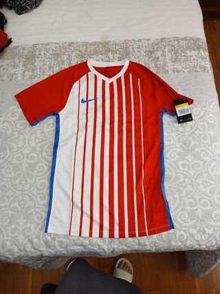 Camiseta deportiva Nike Dry Fit con un diseño de rayas verticales rojas y blancas en la parte frontal y mangas rojas. - Cuello redondo blanco. - Logo de Nike en azul. - Paneles laterales en azul.