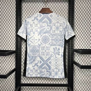 Camiseta con un diseño único que combina elementos de Portugal, Louis Vuitton y Nike. - Patrón de azulejos y monogramas. - Cuello y mangas en contraste.