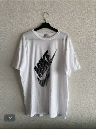 Camiseta Nike XL. Es blanca y luce un diseño de logo Nike vintage en negro.