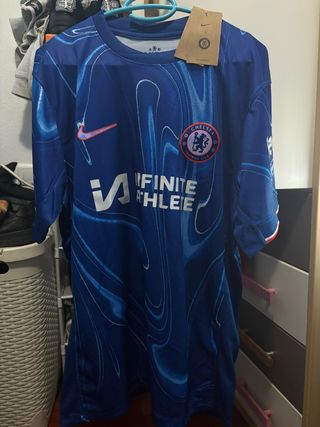 Camiseta de fútbol del Chelsea FC, temporada 2024, con diseño moderno. - Logo de Nike. - Escudo del Chelsea FC. - Patrocinador Infinite Athlete.