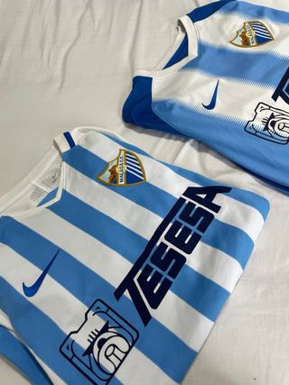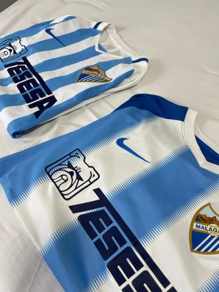 25 PRECIO DE LAS DOS !! Camiseta original del Málaga Club de Fútbol, modelo Tesea. Una talla M otra talla S - Diseño a rayas blancas y celestes. - Logo de Nike bordado. - Escudo del Málaga C.F. en el pecho.