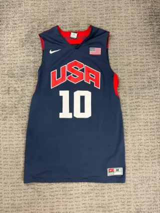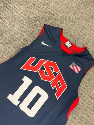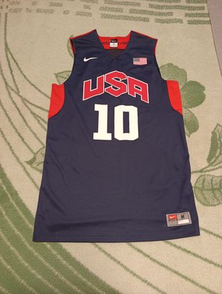 Camiseta de baloncesto de la selección de Estados Unidos usada durante los juegos olimpicos de londres 2012, con el numero 10 de Kobe Bryant, totalmente original con muy poco uso - Diseño oficial Nike. - Número 10 en la parte frontal. - Bandera de Estados Unidos. - Detalles en rojo en los hombros.