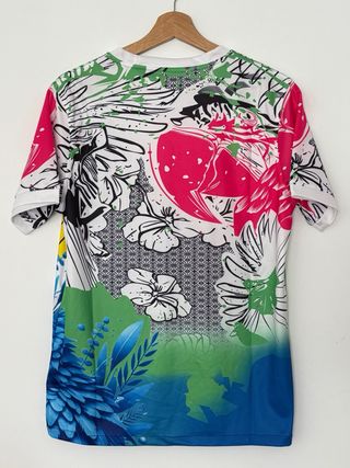 Camiseta deportiva con un diseño moderno y llamativo. - Mangas cortas. - Cuello redondo. - Detalle de logo en color rosa negro y amarillo. - Ribete en las mangas con detalles en rosa y amarillo. Pantalón igual que camiseta.