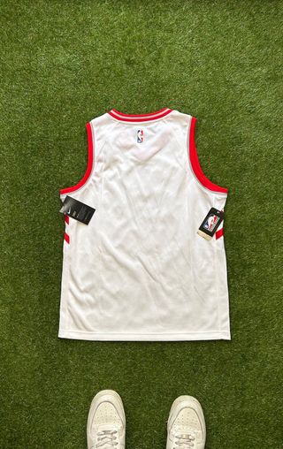 Camiseta de baloncesto de los Toronto Raptors en color blanco. Diseño deportivo con detalles en rojo. - Cuello en V. - Logo de Nike. - Nombre del equipo 'Raptors' en la parte frontal.