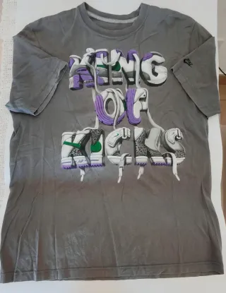 Camiseta gris con un llamativo diseño gráfico en la parte delantera - Estampado King of Kicks con detalles inspirados en zapatillas. - Logo de Nike en la manga.