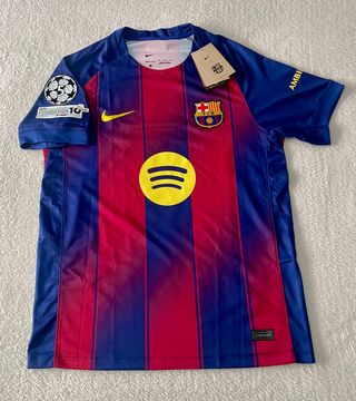 Camiseta del FC Barcelona con el diseño clásico de rayas verticales rojas y azules. - Parche de la UEFA Champions League en la manga. - Logo de Spotify en el frontal. - Logo de Nike. - Escudo del FC Barcelona. Tiene una pequeaña tara en el costado (como muestro en la imagen).