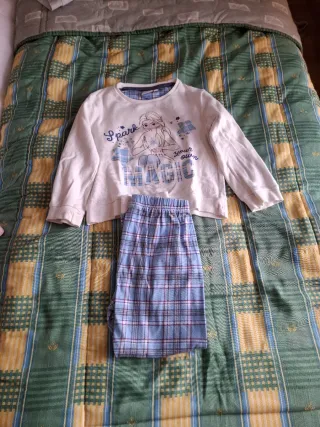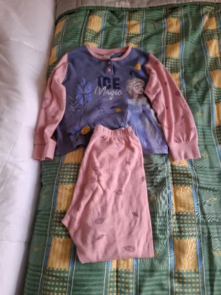 Conjunto de pijama infantil con diseño de Frozen. - Camiseta de manga larga con estampado de Elsa y texto ICE Magic. - Pantalón largo a juego con estampado de hojas. 6 años. Precio 5 € cada pijama. Los dos pijamas juntos 8 €.