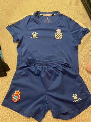 Conjunto deportivo del RCD Espanyol para niño. - Camiseta y pantalón corto. - Talla 4 (110 cm). - Diseño con escudo del club y logo de la marca. Tengo mas equipacion en mi perfil .