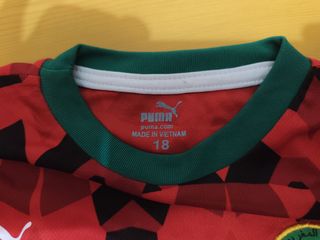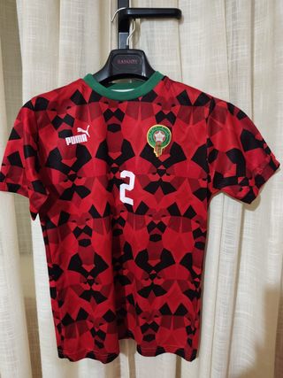 Camiseta de la selección de Marruecos para niño. Estampado en rojo y negro. Puma en blanco y escudo de la selección bordado. Medidas: de axila a axila 42 cm. De largo 61 cm. En perfecto estado.