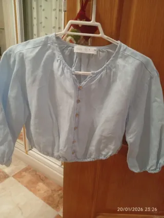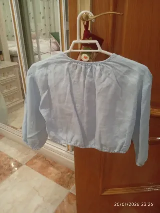 Camisa de manga larga con botones en la parte delantera. Presenta un diseño fruncido en el cuello y elástico en el bajo. Talla 8 - Cuello redondo. - Cierre de botones. - Manga larga abullonada. - Bajo elástico.