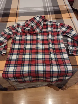 Camisa de cuadros larga para niña con capucha. Talla 13-14. Ideal para un look casual. - Diseño a cuadros en rojo, blanco y azul. - Manga larga. - Cierre de botones.