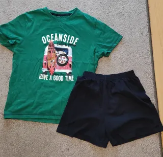 Conjunto de pijama de verano para niño. - Camiseta verde con estampado de furgoneta y surf. - Pantalón corto negro.