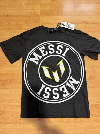 Camiseta negra de Messi para niño, talla 13/14, con el logo del jugador. - Diseño frontal con el nombre 'Messi' y el logo. - Etiqueta original incluida.