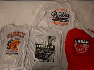 Conjunto de cuatro camisetas de manga larga para niño con diseños variados. Todas talla 12-13 y en buenas condiciones de uso. - Camiseta roja con estampado URBAN STREETWEAR. - Camiseta gris con estampado ATHL.CAMPUS Boston. - Camiseta gris con estampado VARSITY LEAGUE y baloncesto. - Camiseta gris con estampado de puente y BROOKLYN.