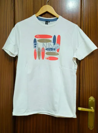 Camiseta de la marca El Niño talla S. Blanca con estampado. Sin costura de remate de mangas y parte baja. 100% algodón Usada una vez
