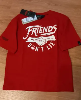 Camiseta de manga corta con estampado de Stranger Things. De la marca Benetton - Diseño Friends Don't Lie con apretón de manos. - Color rojo vibrante. - Detalle del logo de Stranger Things en la manga. Talla 7-8 años Sin estrenar con la etiqueta