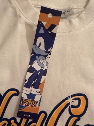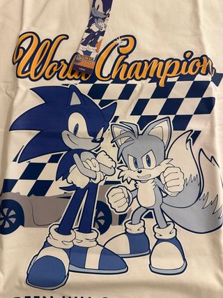 Camiseta infantil con diseño de Sonic y Tails, inspirada en World Champion. - Personajes Sonic y Tails. - Estampado World Champion. - Diseño con motivos de carreras. - Comprada en tienda oficial en Shanghái - la talla es para un niño de 12/13 años o un adulto talla S. - Tejido de algodón de muy buena calidad y gramaje.