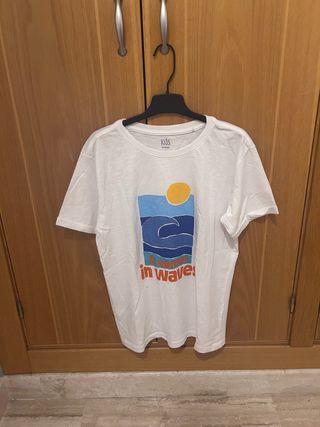 Camiseta blanca para niño con un diseño divertido de olas y sol. - Estampado It comes in waves en la parte delantera. - Cuello redondo. - Manga corta.