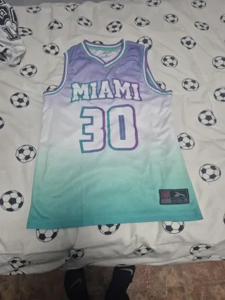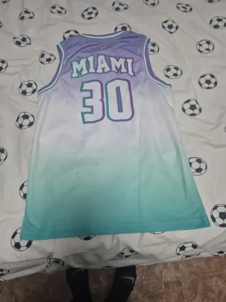 Camiseta de baloncesto con un diseño degradado en tonos morado y verde azulado. Luce el nombre MIAMI y el número 30 en grande. - Diseño degradado morado a verde azulado. - Nombre MIAMI en la parte superior. - Número 30 en el centro. - Etiqueta de la marca Tenth en la parte inferior. -Talla niño/a 12 años