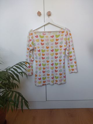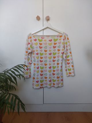 Camiseta de manga corta con un divertido estampado de botones y corazones en distintos tamaños. Prenda original de la marca. Tejido algodón / lino