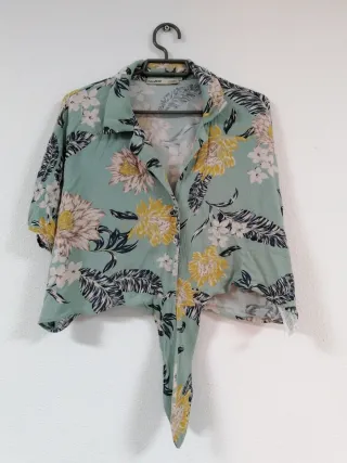 Blusa de Pull&Bear con un estampado floral vibrante. El diseño anudado en la parte delantera le da un toque moderno y chic. - Manga corta. - Cuello camisero. - Estampado de flores amarillas y hojas verdes.