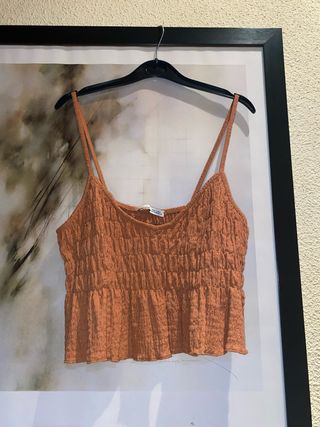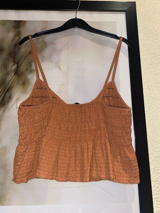 Este top estilo boho chic presenta un diseño fruncido muy favorecedor. - Tejido con textura. - Tirantes finos. - Corte cropped.