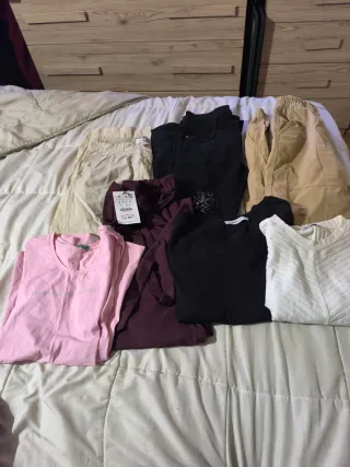 Lote de ropa para chica en talla M. Incluye tres prendas variadas. - Pantalón beige tipo dockers - Pantalón beige clarito tipo dockers - Pantalón caqui - Camiseta rosa - pantalón de vestir granate - Camiseta negra - jersey negro finito manga larga