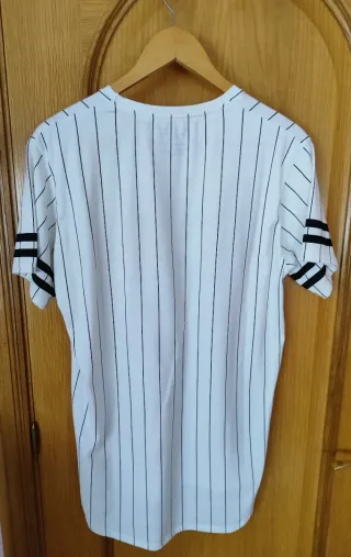 Camiseta de Pull&Bear con un diseño de rayas verticales. Es de chico, pero para chica queda estilo oversize y larga. - Diseño de rayas verticales en blanco y negro. - Detalle de rayas en las mangas.
