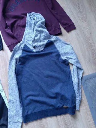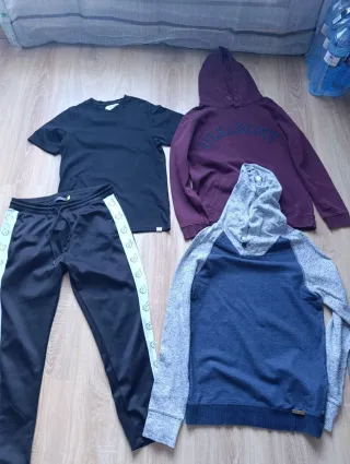 Conjunto de ropa para chico en talla S. Incluye varias prendas , tallas marca varias pero es del mismo chico y corresponde talla 36-S, podéis preguntar las medidas - Camiseta negra. - Sudadera morada con logo Lyle & Scott. - Sudadera gris y azul. - Pantalón deportivo negro con detalles laterales.