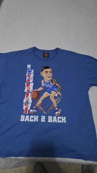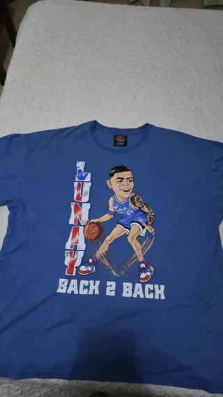 Camiseta de manga corta con estampado de Lunay jugando al baloncesto. - Diseño con el nombre LUNAY en vertical. - Ilustración de un jugador de baloncesto. - Texto BACK 2 BACK en la parte inferior.
