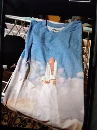 Conjunto de dos camisetas de Pull&Bear. - Camiseta negra con diseño gráfico blanco.Diseño Tupac,se vende sola - Camiseta azul con estampado de cohete espacial y logo NASA.
