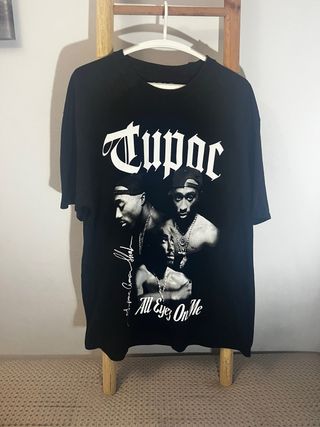 Camiseta negra con estampado de Tupac Shakur. - Diseño oversize. - Estampado frontal con Tupac y All Eyes On Me. - Imagen de Tupac Shakur.