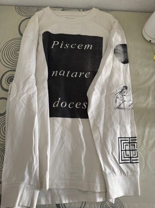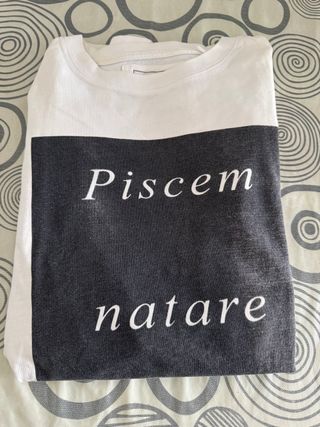 Camiseta de Pull&Bear con un diseño moderno. - Parte superior blanca. - Parte inferior gris con texto blanco. - Estampado Piscem natare.