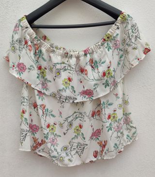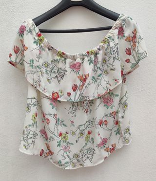 Blusa de Pull and Bear con un bonito estampado floral. - Diseño con escote Bardot. - Volante en el pecho. - Mangas cortas. - Tejido ligero, de poliéster. - Estado: bien cuidada, como nueva. - Medidas: 45 de largo y 42 de hombro. - Talla: 40 / L.